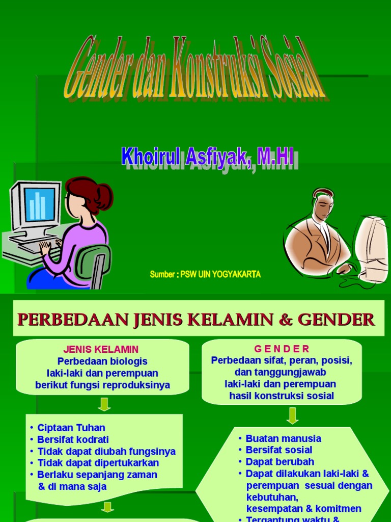 DEWI ALWIYATUL MUZAIYANAH NIM. Menurut Puspitawati 2013 kata gender dapat diartikan sebagai perbedaan peran fungsi status dan tanggungjawab pada laki-laki dan perempuan sebagai hasil dari bentukan konstruksi sosial. Gender berbeda dari jenis kelamin biologis.